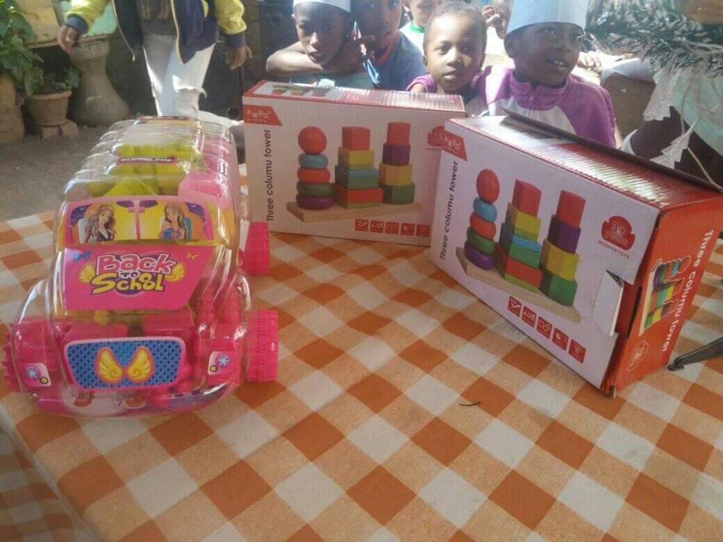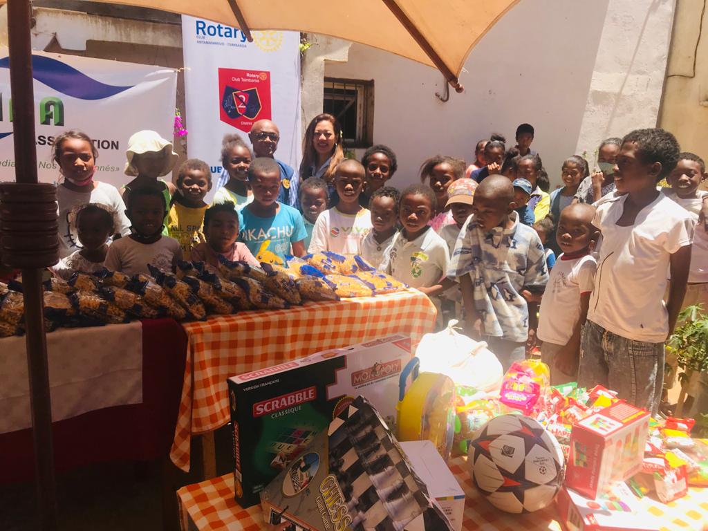 Le Rotary Club Antananarivo Tsimbaroa a offert aux 50 enfants de l’association Dina à Ambohibao des jouets, des jeux, des friandises et des biscuits ainsi que des produits de premières nécessité (sac de riz et des macaronis). Parmi les jeux on peut citer des jeux de cubes, de construction, d’échec, de quilles, ballon de foot, de scrabble, de monopoly, des colonnes pour les petits.
