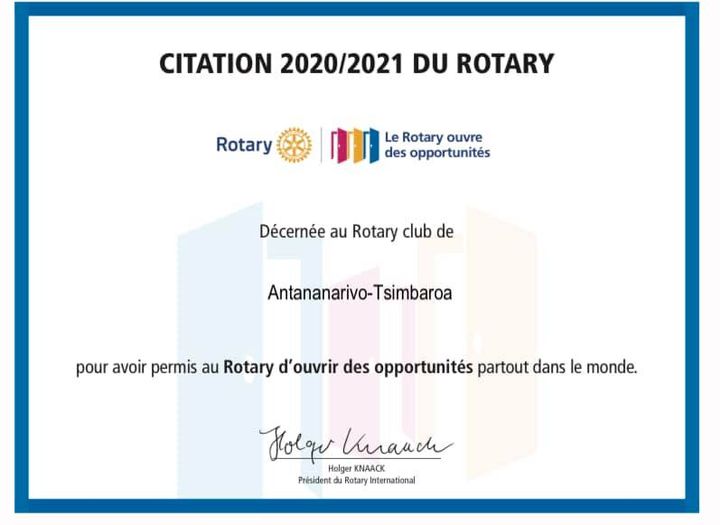 Félicitations aux membres et au comité 2020-2021! Malgré la crise du Covid 19 le club a obtenu la Citation Présidentielle pendant le mandat du PRI Holger KNAACK et de Pdt Patrick RAKOTOMAHANDRY en reconnaissance de ses efforts à l’atteinte des objectifs du club.