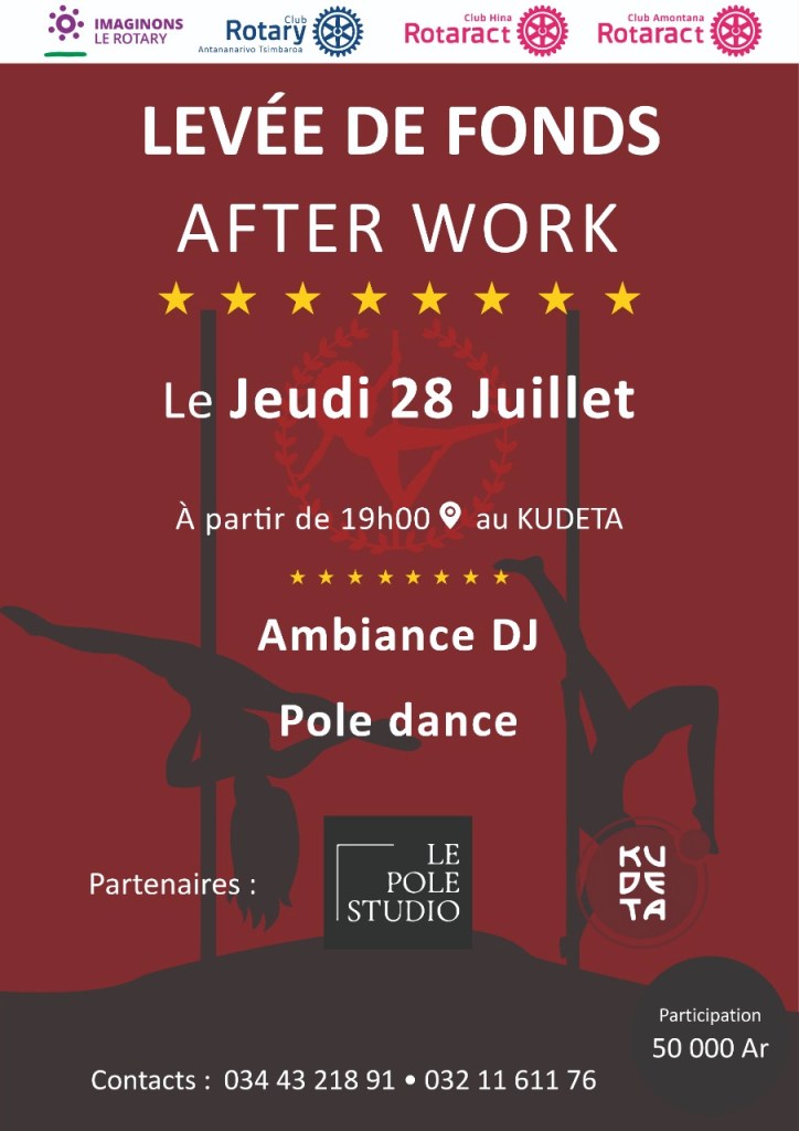 Pour financer nos actions sociales du mandat 2022/2023 le Rotary Club Antananarivo TSIMBAROA organise une levée de fonds After work qui est un spectacle de Pole Dance.
