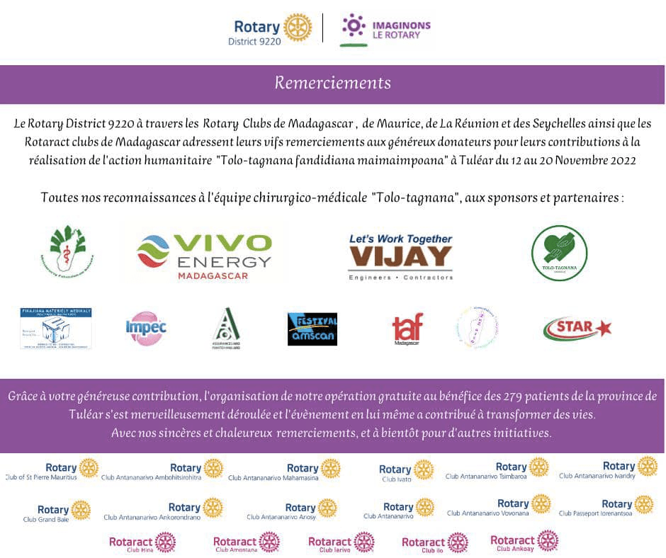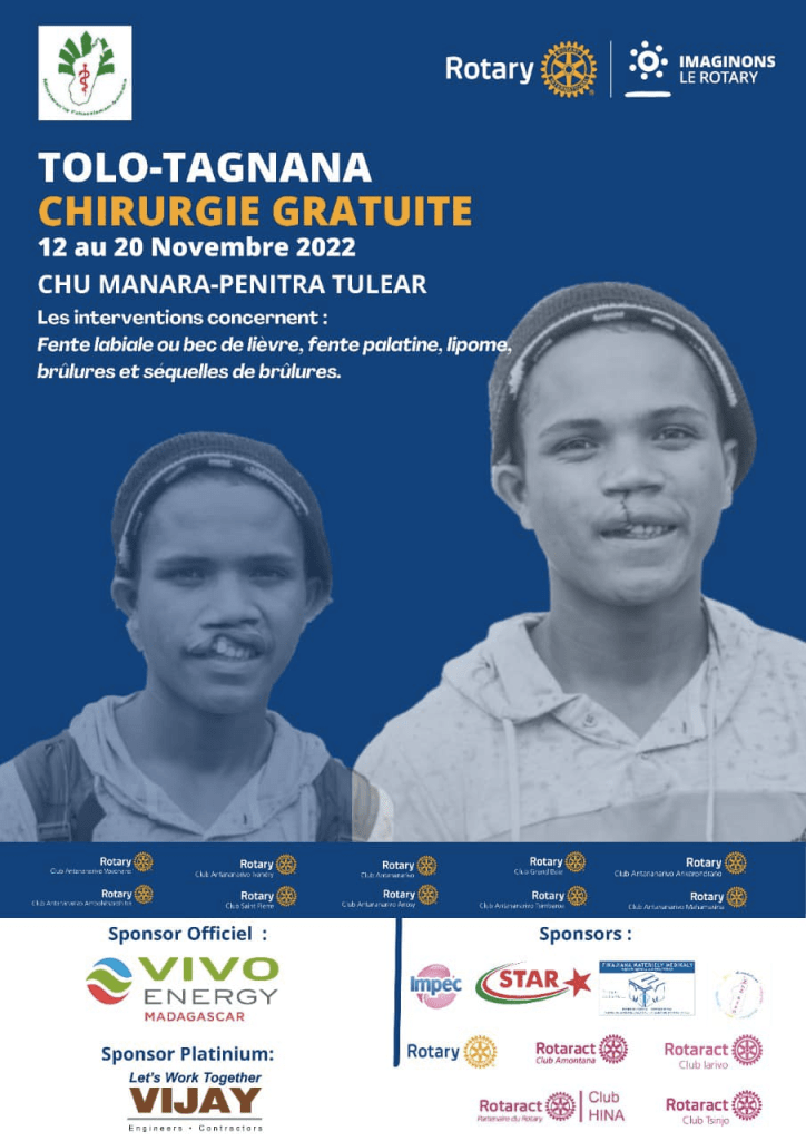 278 personnes atteintes de fente labiale /palatine, séquelles de brûlures, lipome, et d’hernie ont bénéficié de la chirurgie gratuite Tolo-tagnana réalisée à l’hôpital Manara-penitra de Tuléar du 12 au 20 Novembre 2022 . Le Rotary club d’Antananarivo Tsimbaroa a participé activement à cette campagne et remercie l’équipe médicale chevronnée , les généreux donateurs et sponsors qui ont contribués à la réalisation de cette grande action.